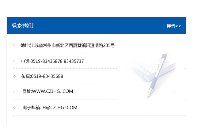 傳真:0519-83435688    郵編:213135    網址:WWW.czjhgj_com.htioo.com    電子郵箱:JH@czjhgj_com.htioo.com